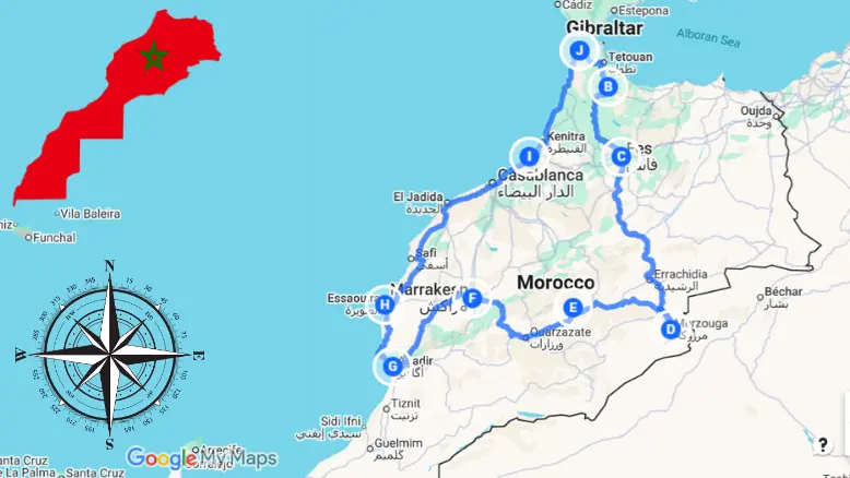 Tangier, Chefchaouen, Volubilis, Meknes, Fes, Midelt, Erfoud, Merzouga, Todgha Gorges, Dades Valley, Ouarzazate, Ait Ben Haddou, Marrakech, Agadir, Essaouira, Casablanca, Rabat, Asilah
